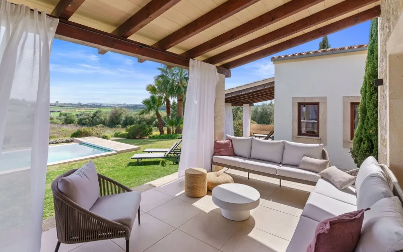 Die Außenbereiche sind liebevoll angelegt und laden mit mehreren Terrassen dazu ein, das mediterrane Klima in vollen Zügen zu genießen. Ob entspanntes Frühstück, gesellige Abende oder ruhige Rückzugsmomente, hier entsteht ein harmonisches Zusammenspiel von Innen- und Außenleben.