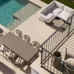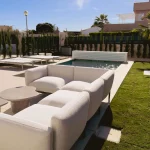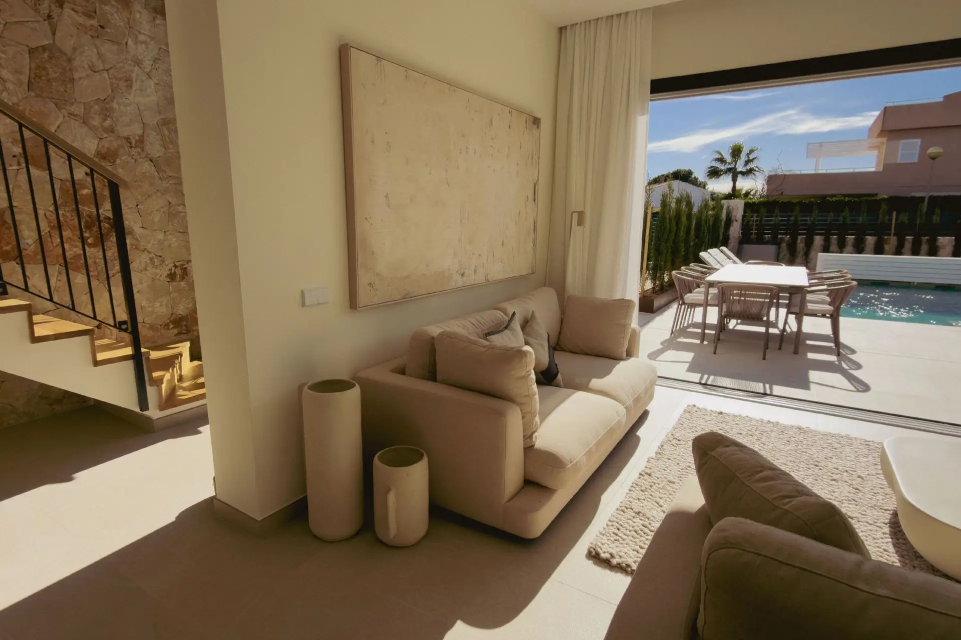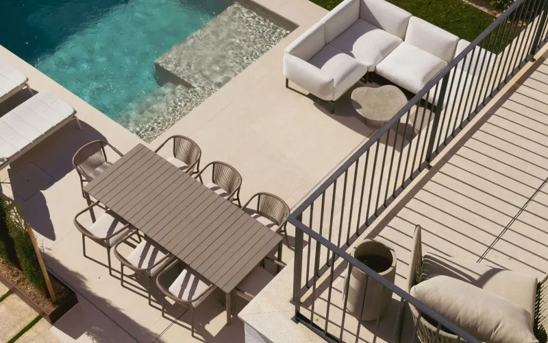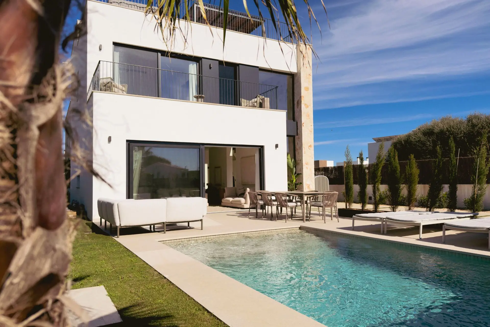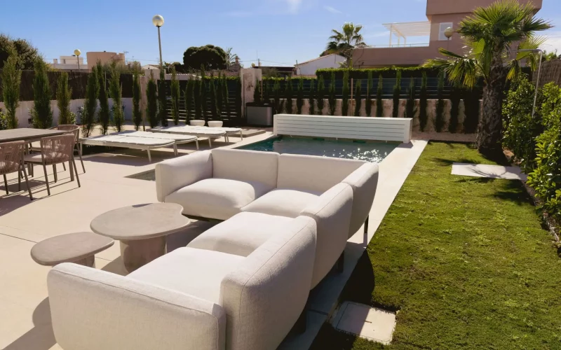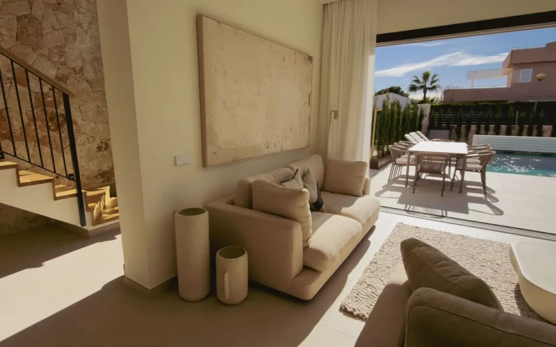 Die großzügige Südwest-Terrasse mit eigenem Pool bietet ideale Voraussetzungen, um sonnige Tage im Freien zu verbringen – ob beim Relaxen auf der Liege, einer Abkühlung im Wasser oder bei gemeinsamen Mahlzeiten unter freiem Himmel. Die Dachterrasse mit Außenküche erweitert den Wohnraum nach oben und schafft den perfekten Rahmen für gesellige Abende, bei denen besonders die Sonnenuntergänge und das Meerespanorama im Mittelpunkt stehen.