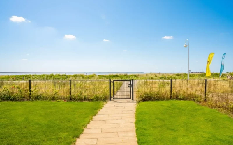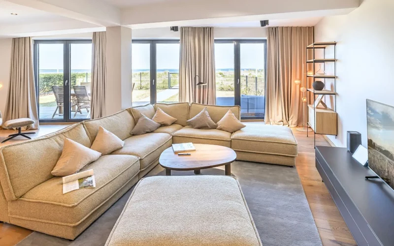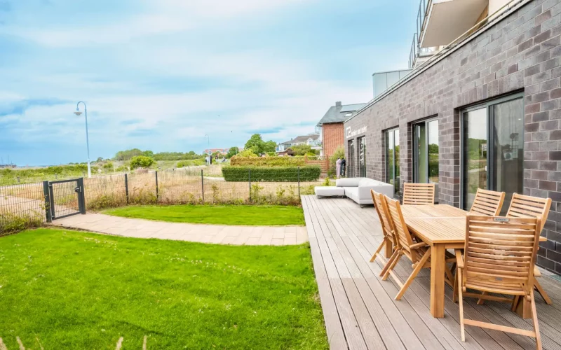Der helle Wohn- und Essbereich mit großen, bodentiefen Fensterfronten sorgt für ein lichtdurchflutetes Ambiente und lässt das Meer nahezu Teil des Innenraums werden. Von hier aus gelangen Sie direkt auf die Terrasse mit eigenem Garten – perfekt, um den Tag entspannt beim Frühstück mit Meeresrauschen zu beginnen.