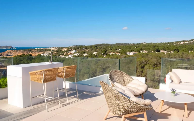 Diese hochwertige Neubauvilla an der Westküste von Ibiza verbindet modernen Wohnkomfort mit dem entspannten Flair des Mittelmeers. Die stilvolle Architektur, kombiniert mit erstklassiger Ausstattung und einer besonderen Lage, schafft einen Ort, an dem Erholung und Natur harmonisch ineinandergreifen.