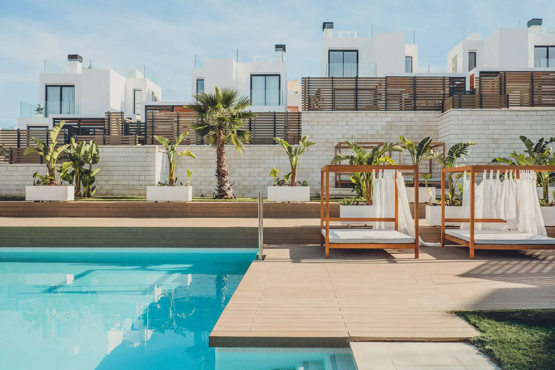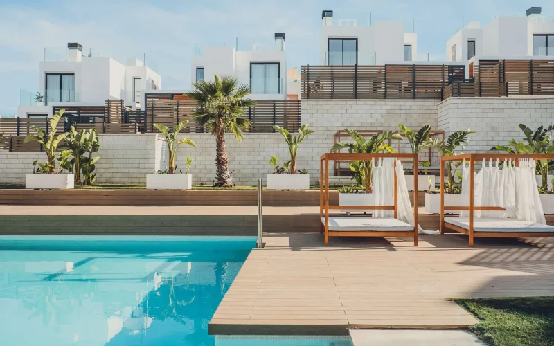Die exklusive Anlage selbst bietet zusätzliche Annehmlichkeiten wie acht gemeinschaftlich nutzbare Pools, einen Padel-Tennisplatz und eine gepflegte, mediterran gestaltete Gartenlandschaft, ideal für aktive Erholung und entspannte Stunden.