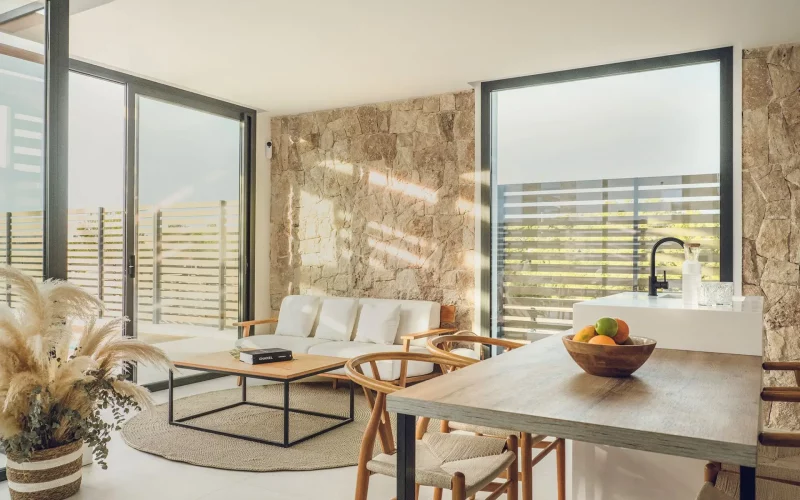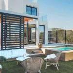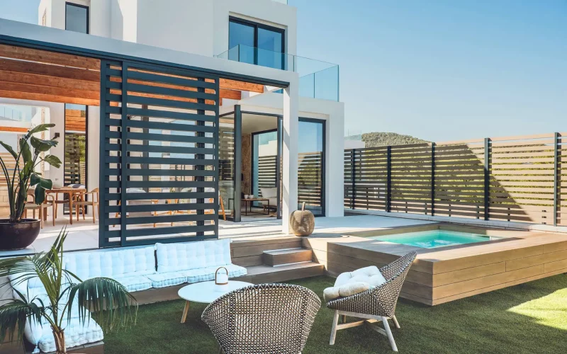 Auf der großzügigen Dachterrasse erwarten Sie ein gemütlicher Lounge- und Essbereich, ein Whirlpool sowie ein beeindruckender Ausblick auf das Meer und die umliegende Landschaft. Ob beim Sonnenbaden, bei einem entspannten Drink am Abend oder beim Genießen der berühmten Sonnenuntergänge der Insel, hier entstehen unvergessliche Momente. Ein kleiner Salzwasserpool sowie liebevoll gestaltete Außenbereiche unterstreichen das fließende Zusammenspiel von Innen- und Außenleben. Ergänzt wird das Angebot durch einen privaten Fitness- und Wellnessbereich mit Sauna.